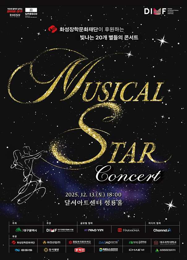 국내 최초 청소년 뮤지컬 경연 대회 DIMF 뮤지컬 스타 콘서트가 개최됩니다. ![]() - 일시: 2025. 12. 13.(토) 18:00 - 장소: 달서아트센터 청룡홀 - 사전 예약 오픈: 2025. 11. 28.(금) 14:00 - 예약 방법: 네이버 예약 (1인 2매) |